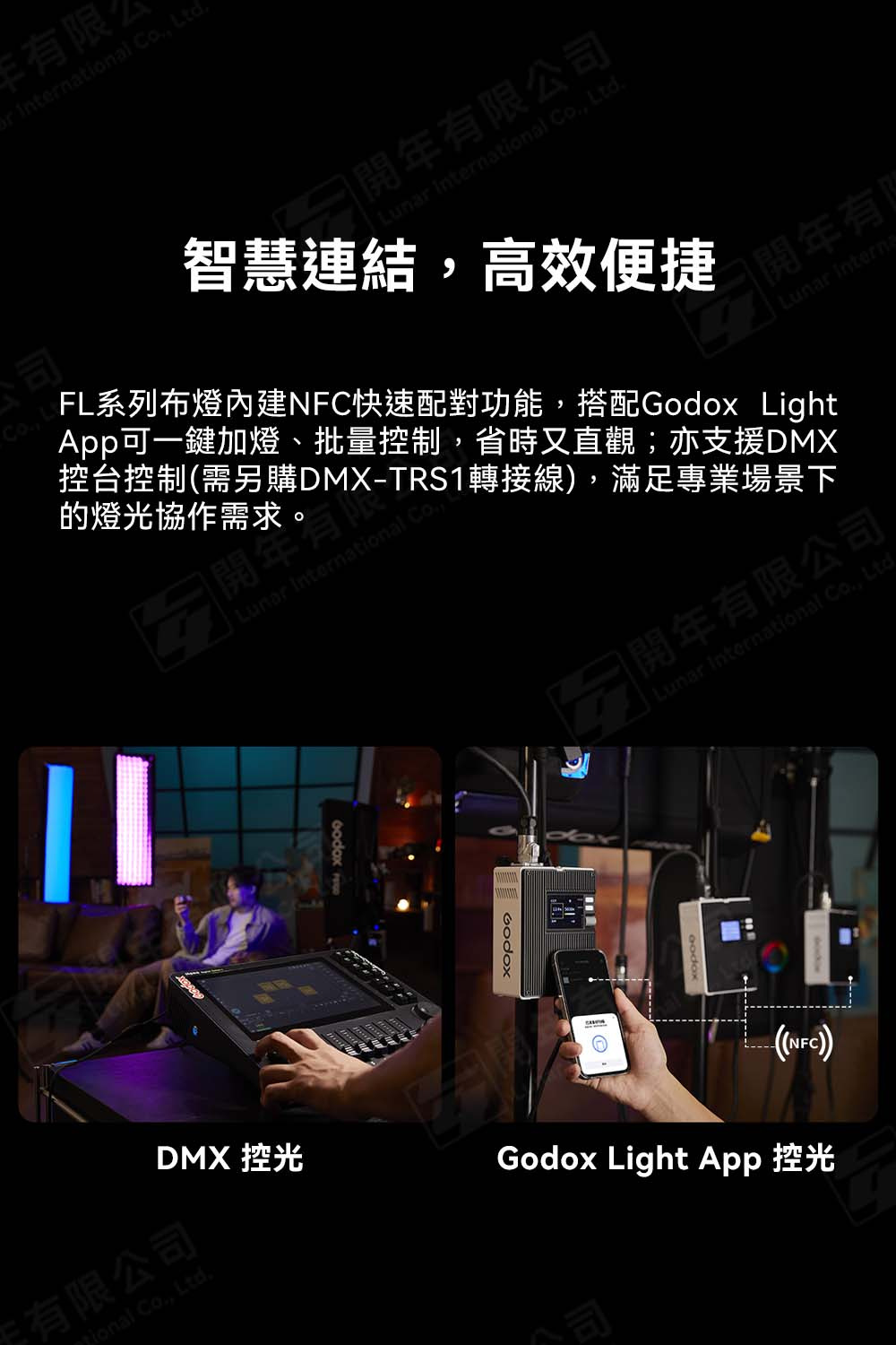 內建NFC快速配對,搭配Godox Light App可批量控光,省時又直觀,並支援DMX控光(需另購DMX-TRS1轉接線