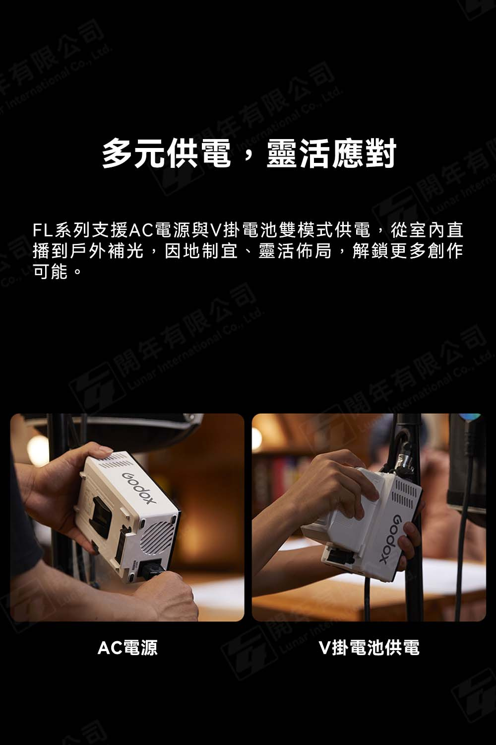 支援AC電源與V掛電池供電,因地制宜,靈活佈局,解鎖更多創作可能