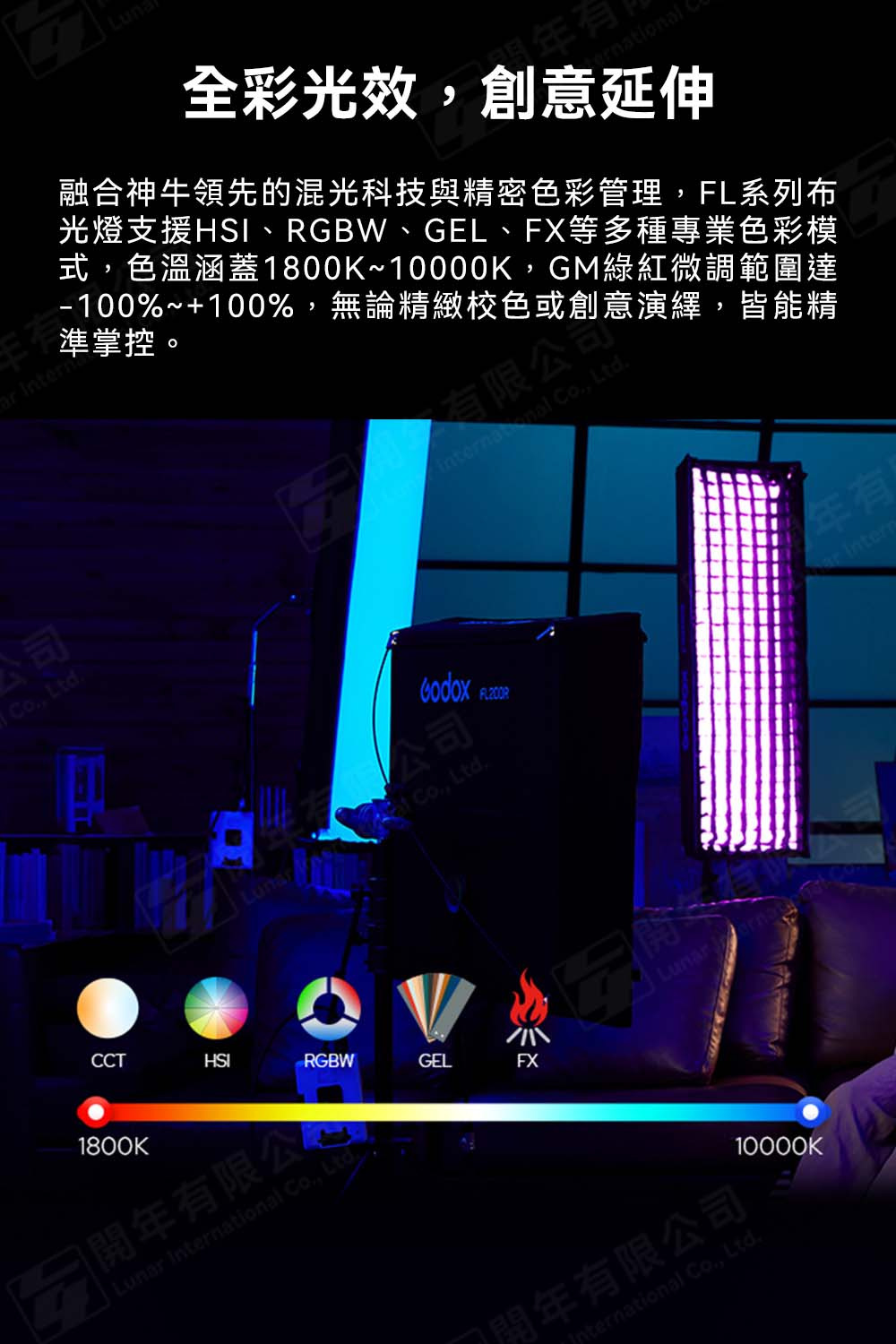 內建HSI、RGBW、GEL、FX等多種專業色彩模式,色溫涵蓋1800K~10000K,並支援-100%~+100%GM值微調