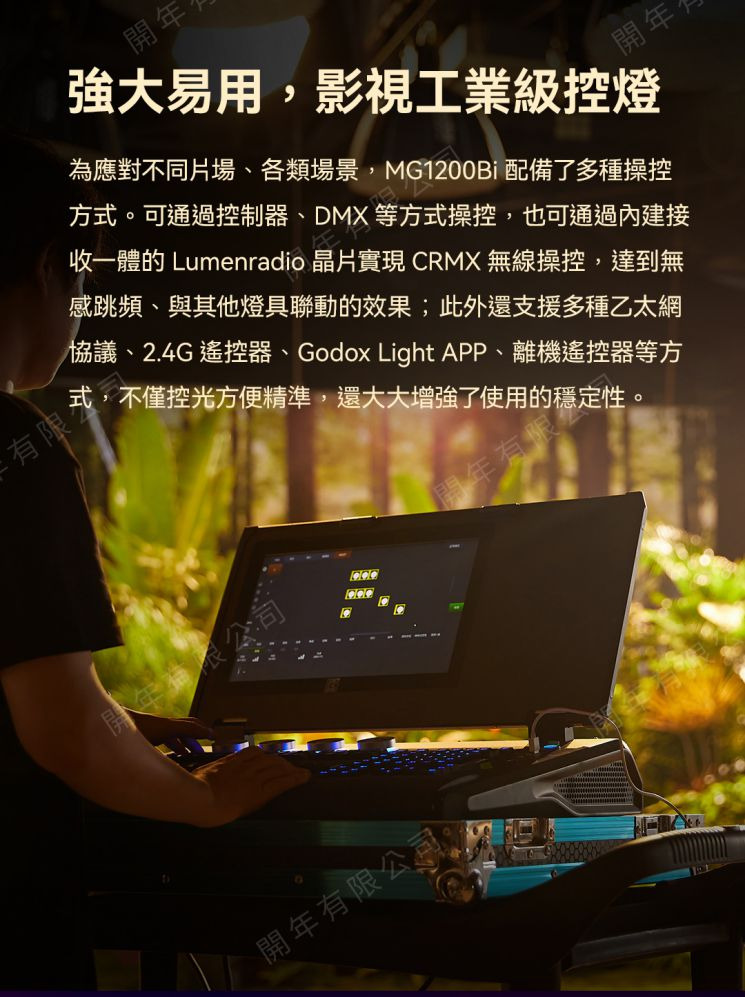 .多種操控方式:可通過控制器、DMX等方式操控,也可通過Lumenradio晶片實現CRMX無線操控;此外還支援多種乙太網協議、2.4G遙控器、Godox Light APP、離機遙控器等方式。