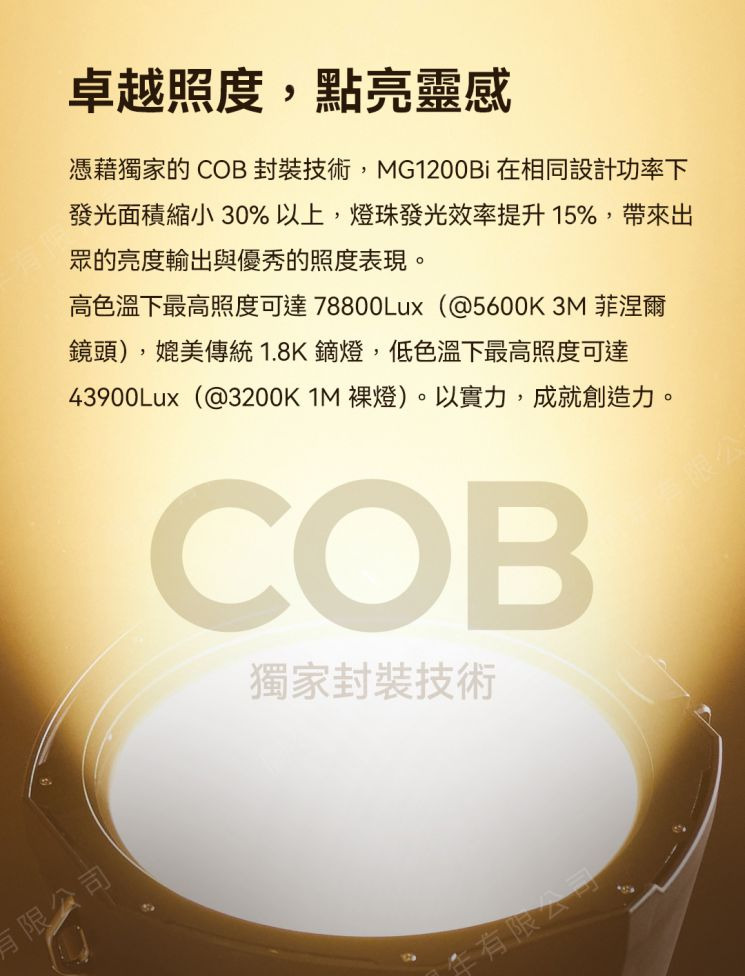 .獨家的COB封裝技術,MG1200Bi在相同設計功率下發光面積縮小30%以上,燈珠發光效率提升15%,帶來出眾的亮度輸出與優秀的照度表現。