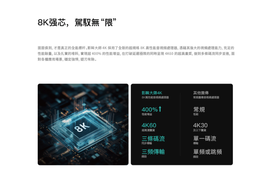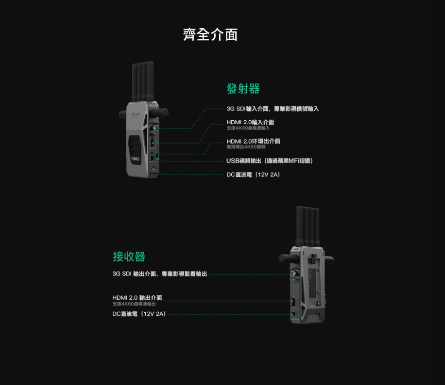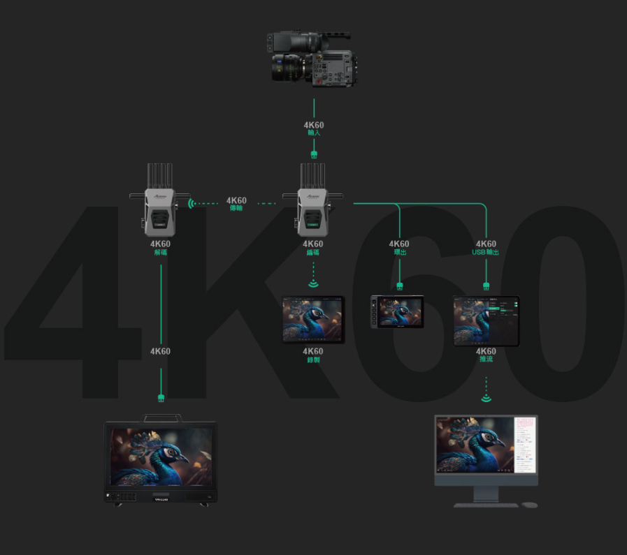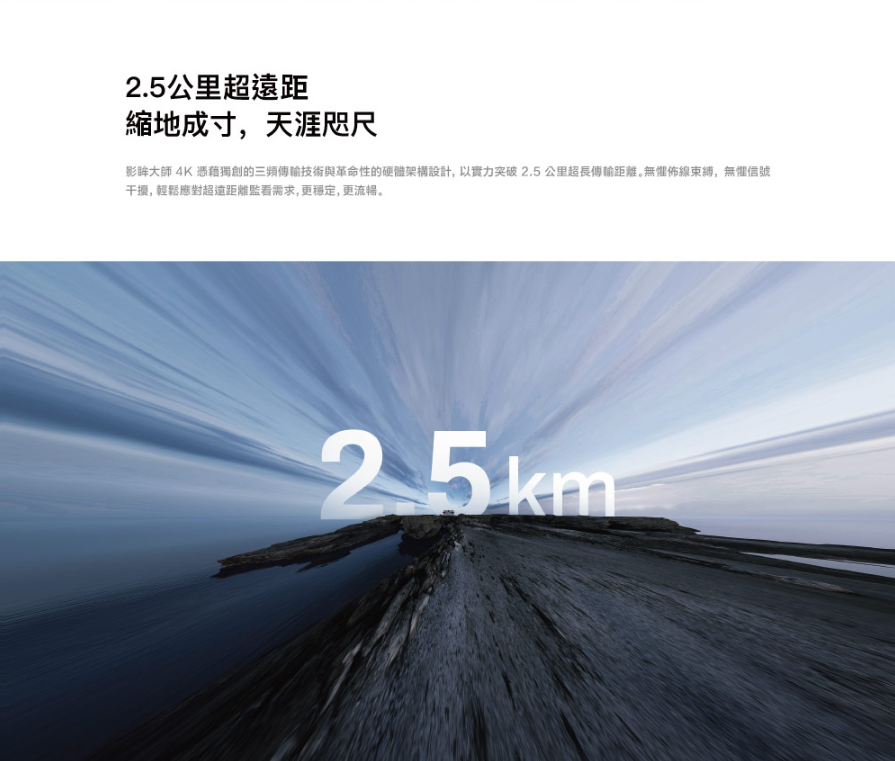 影眸大師 4K 憑藉獨創的三頻傳輸技術與革命性的硬體架構設計,以實力突破 2.5 公里超長傳輸距離。無懼佈線束縛,無懼信號 干擾,輕鬆應對超遠距離監看需求,更穩定,更流暢。