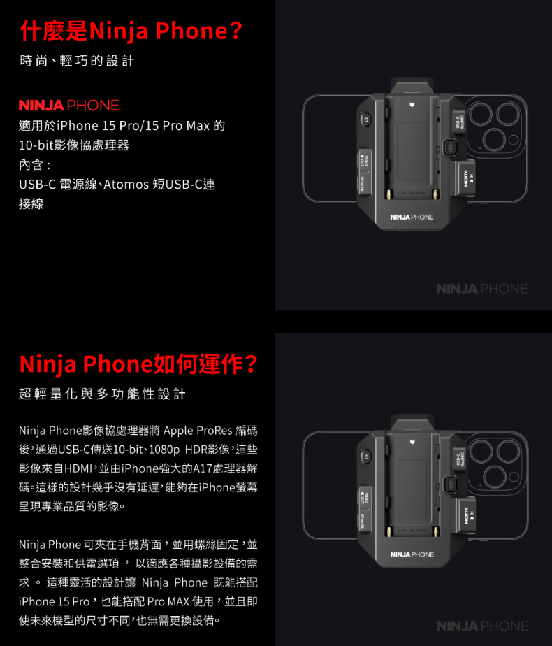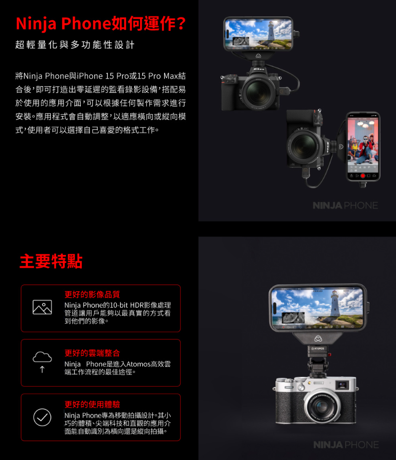 Ninja Phone專為移動拍攝設計。其小巧的體積、尖端科技和直觀的應用介面能自動識別為橫向還是縱向拍攝