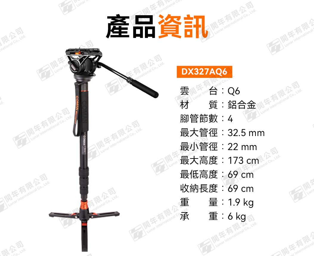 Coman DX327AQ6 是一款高性能的鋁合金運動錄影支撐單腳架,專為專業攝影和錄影需求而設計。它附有全新的 Q6 雲台,提供高度的操作靈活性和精確度,適合多種攝影情況和風格。