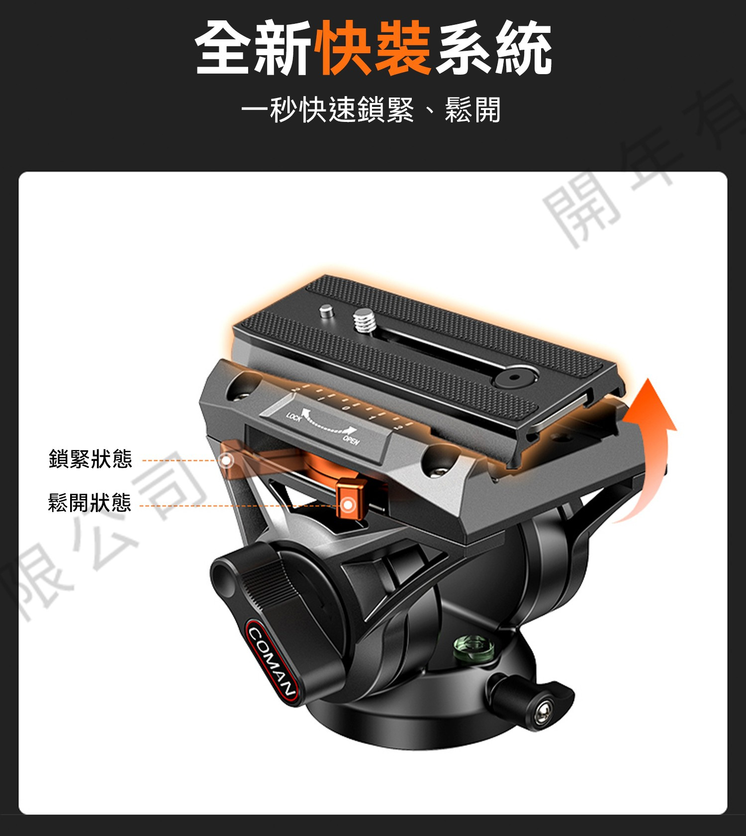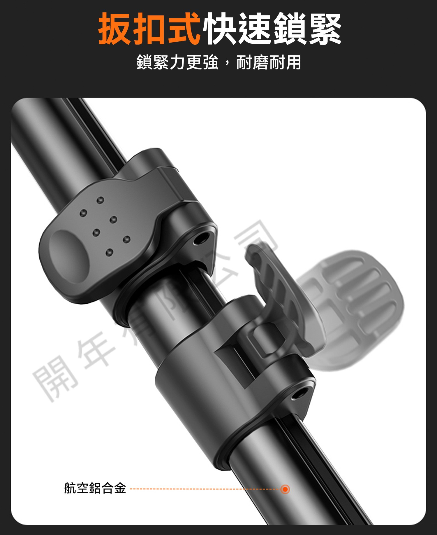 扳扣式鎖緊機制:創新的扳扣設計,使腳管鎖緊更迅速、更簡單,節省您在外景拍攝時的寶貴時間。
