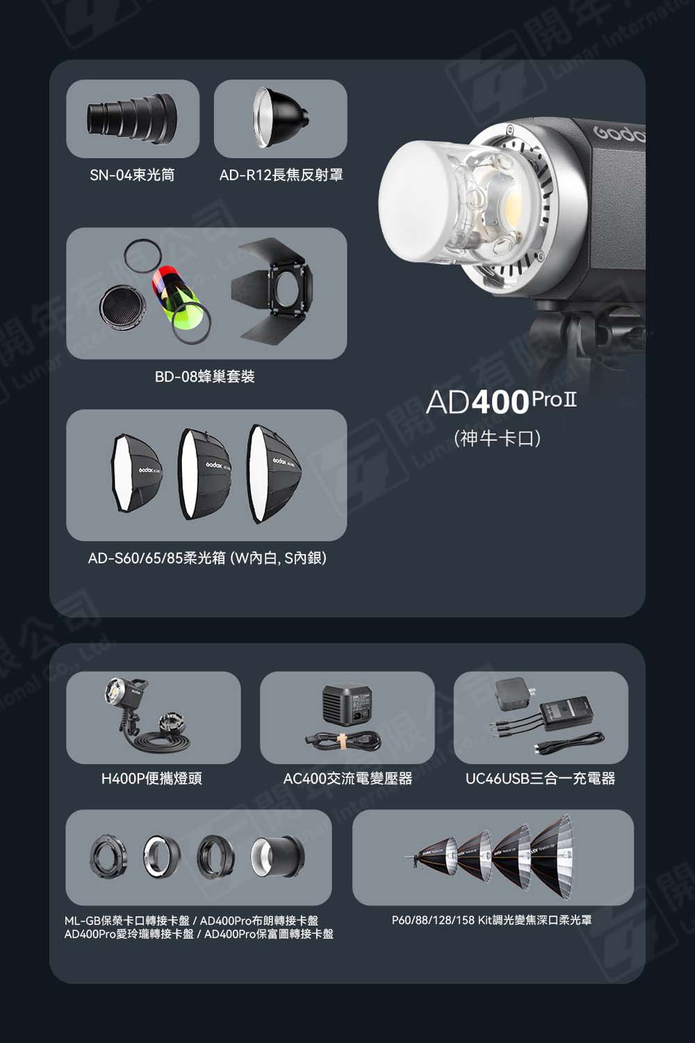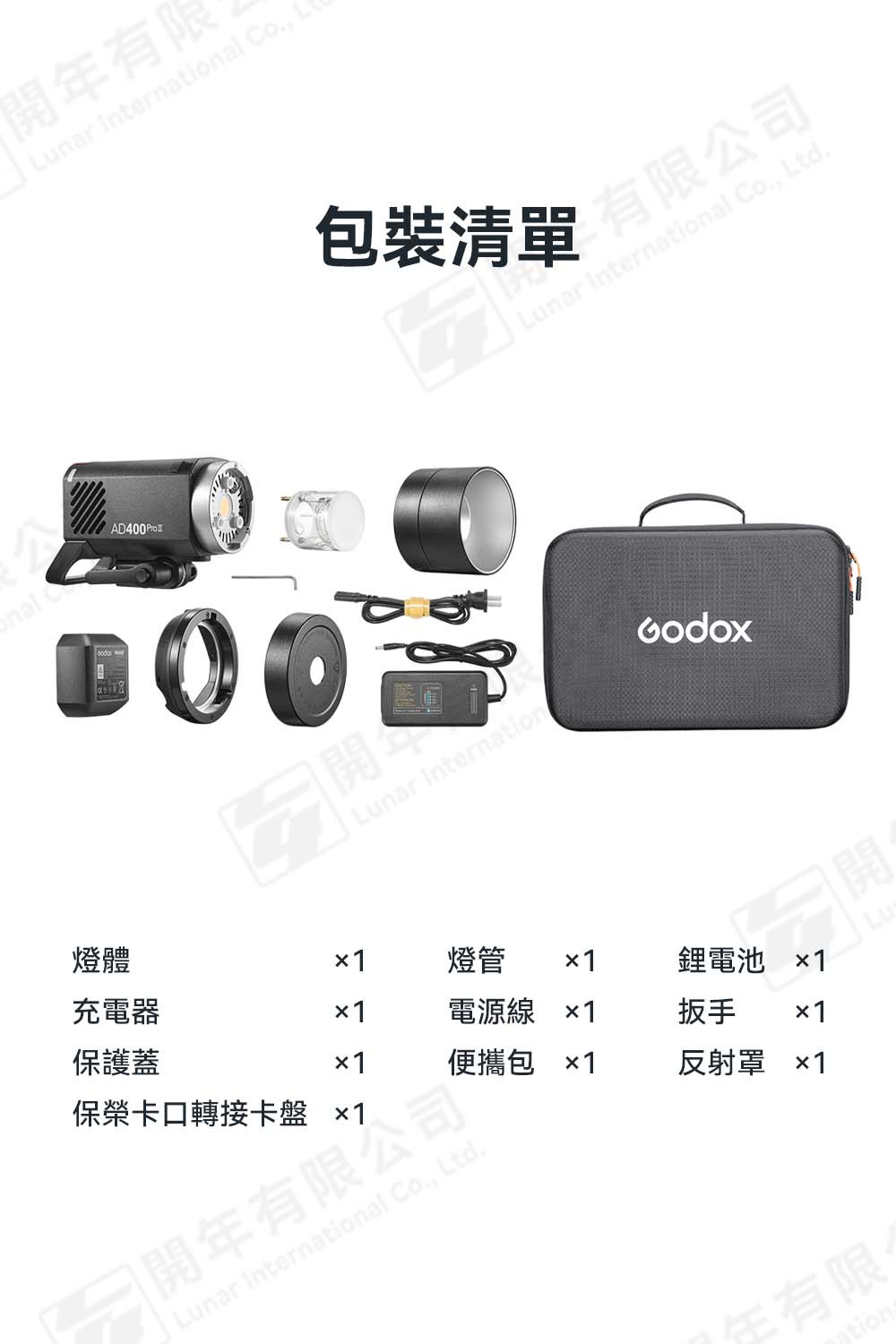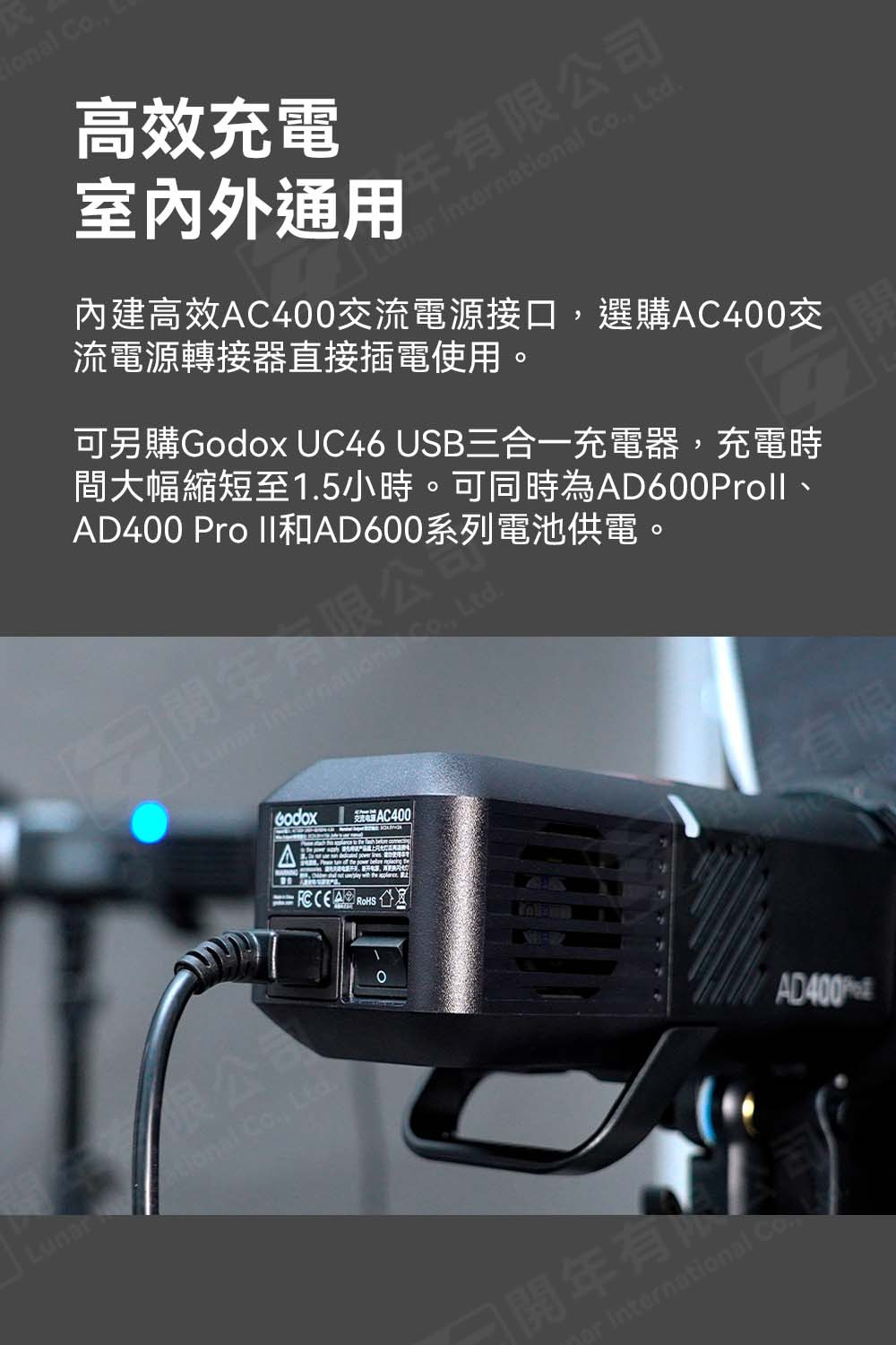 可另購Godox UC46 USB三合一充電器,充電時間大幅縮短至1.5小時,同時為AD600ProII、AD400 Pro II和AD600系列產品供電