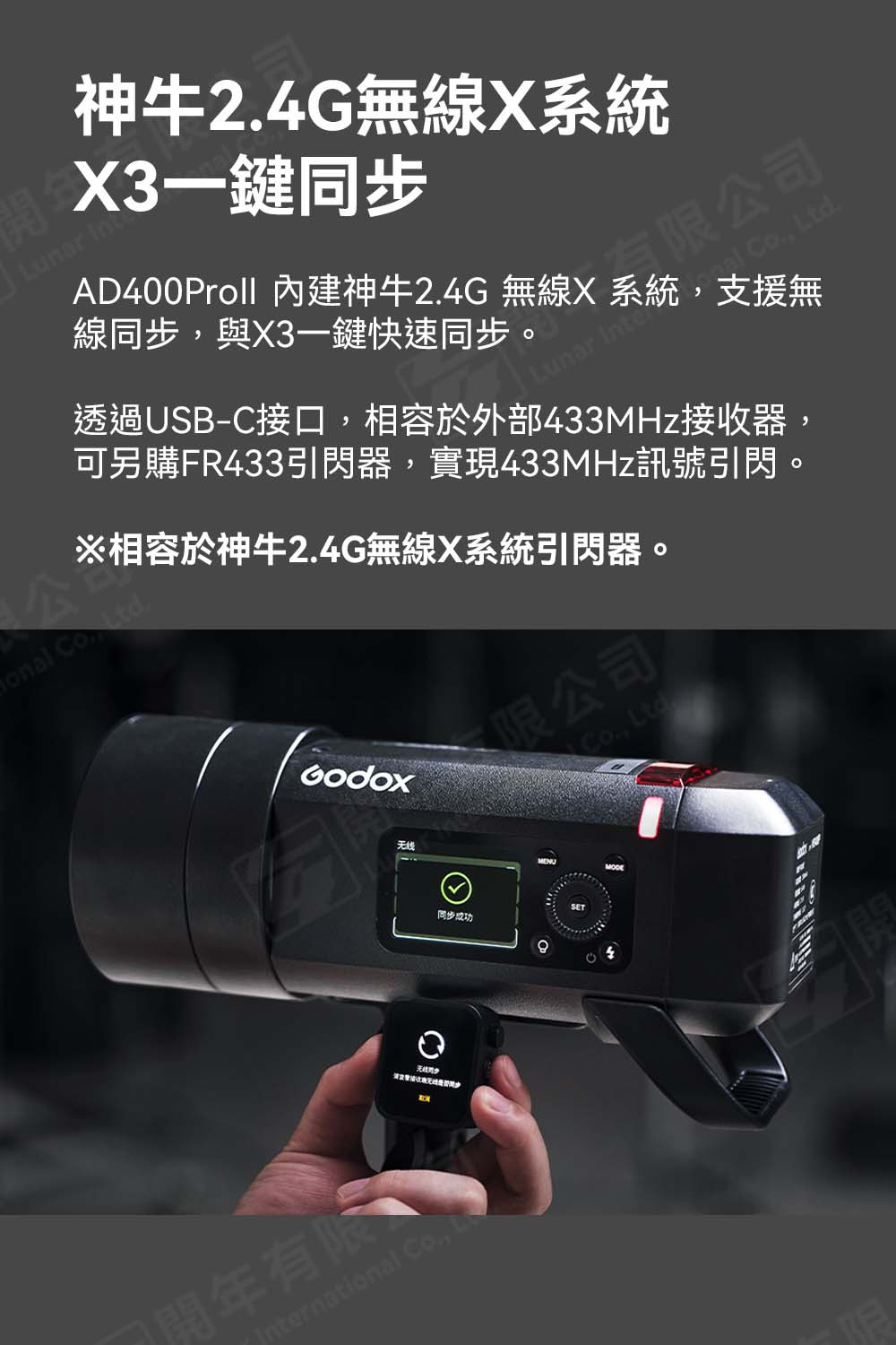 AD400Pro II 內建神牛2.4G 無線X系統,支援「無線同步」功能,實現與X3一鍵快速同步。內建USB-C接口,可另購FR433引閃器,實現433MHz訊號引閃。