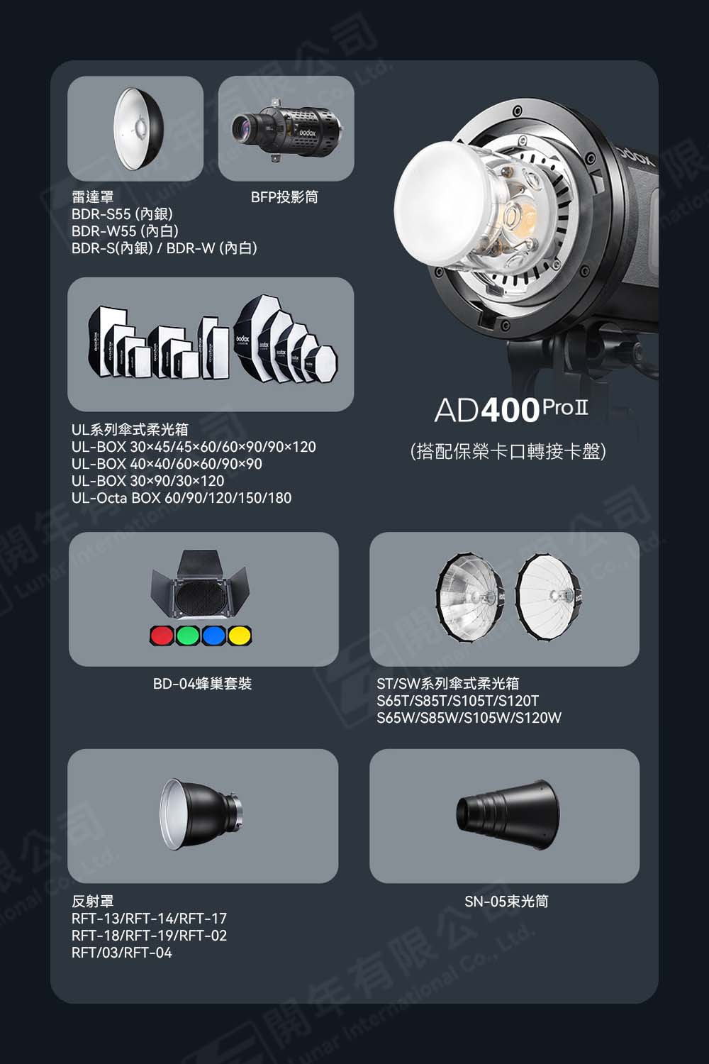 神牛AD400Pro II 採用神牛卡口設計,外接保榮卡口適配卡盤(標配),廣泛兼容神牛卡口和保榮卡口光學附件,為創作提供更多可能