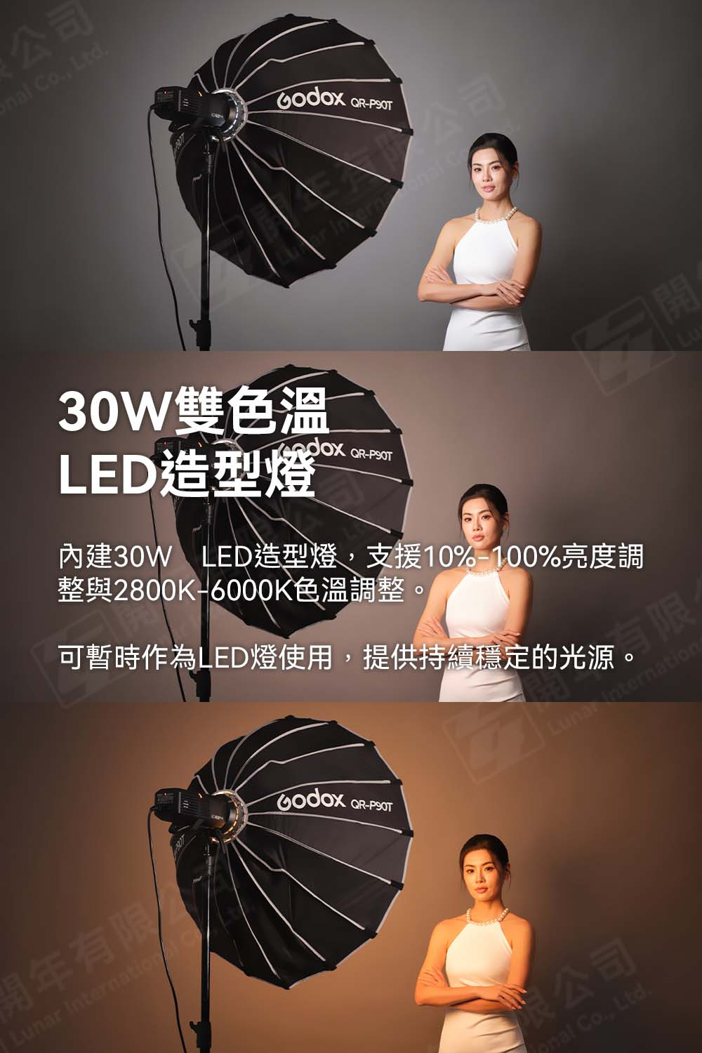 內建30W LED造型燈,支援10%-100%亮度調整與2800K-6000K色溫調整;可暫時作為LED 燈,提供持續穩定的光源