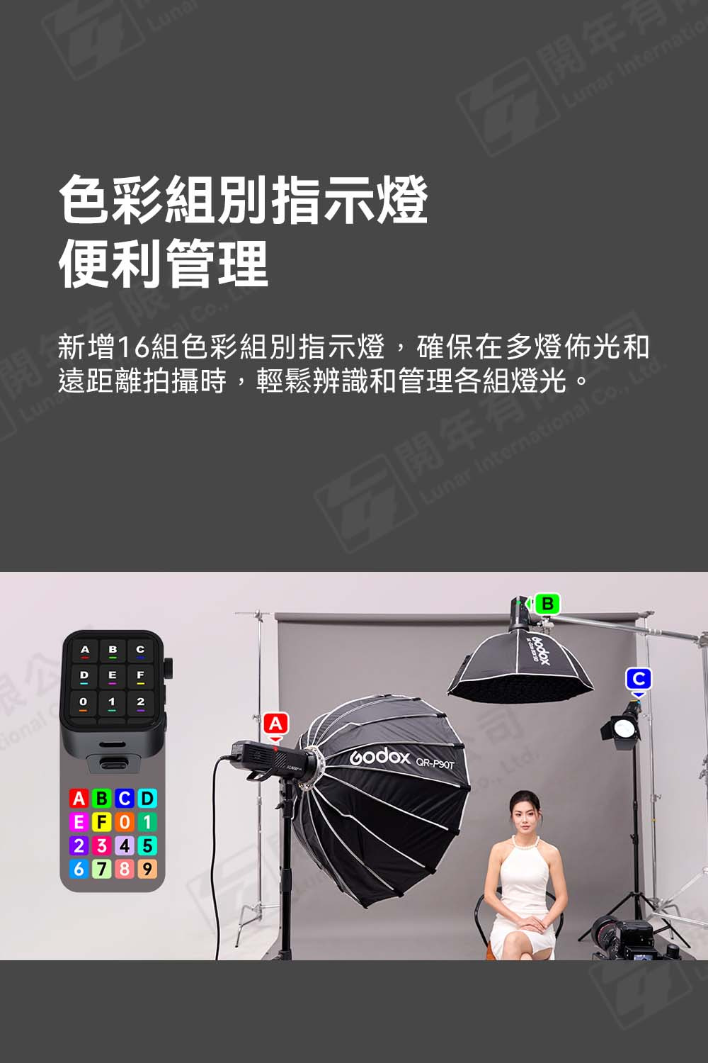 新增16組色彩組別指示燈,確保在多燈佈光和遠距離拍攝時,輕鬆辨識和管理各組燈光