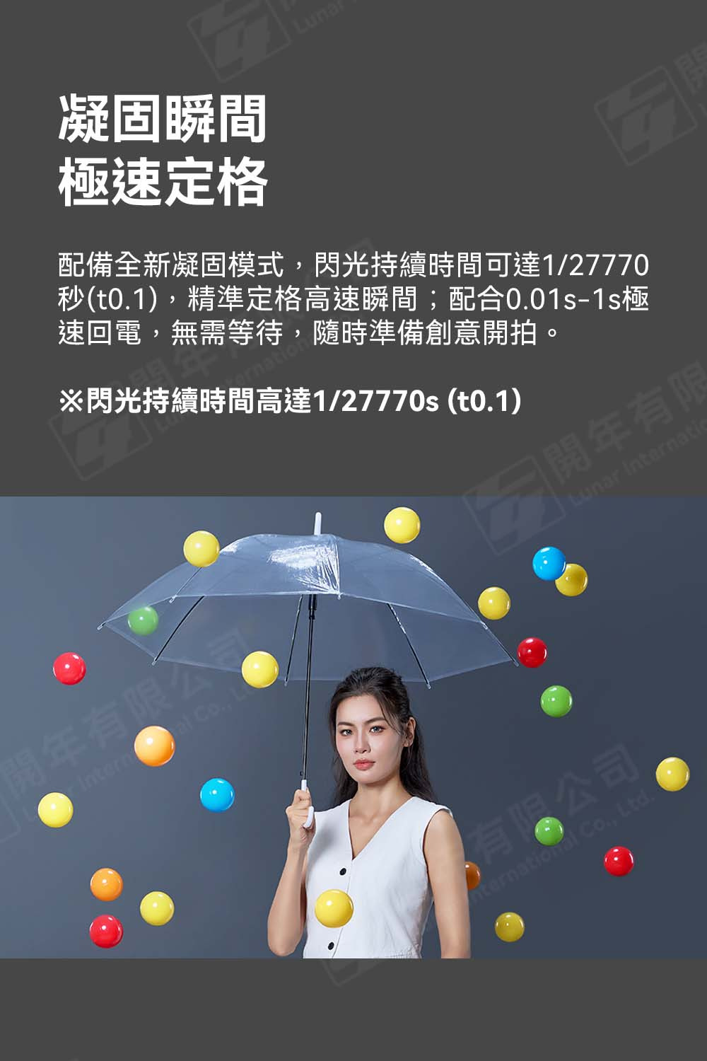 .全新凝固模式,閃光持續時間可達1/27770 秒(t0.1),配合0.01s-1s極速回電