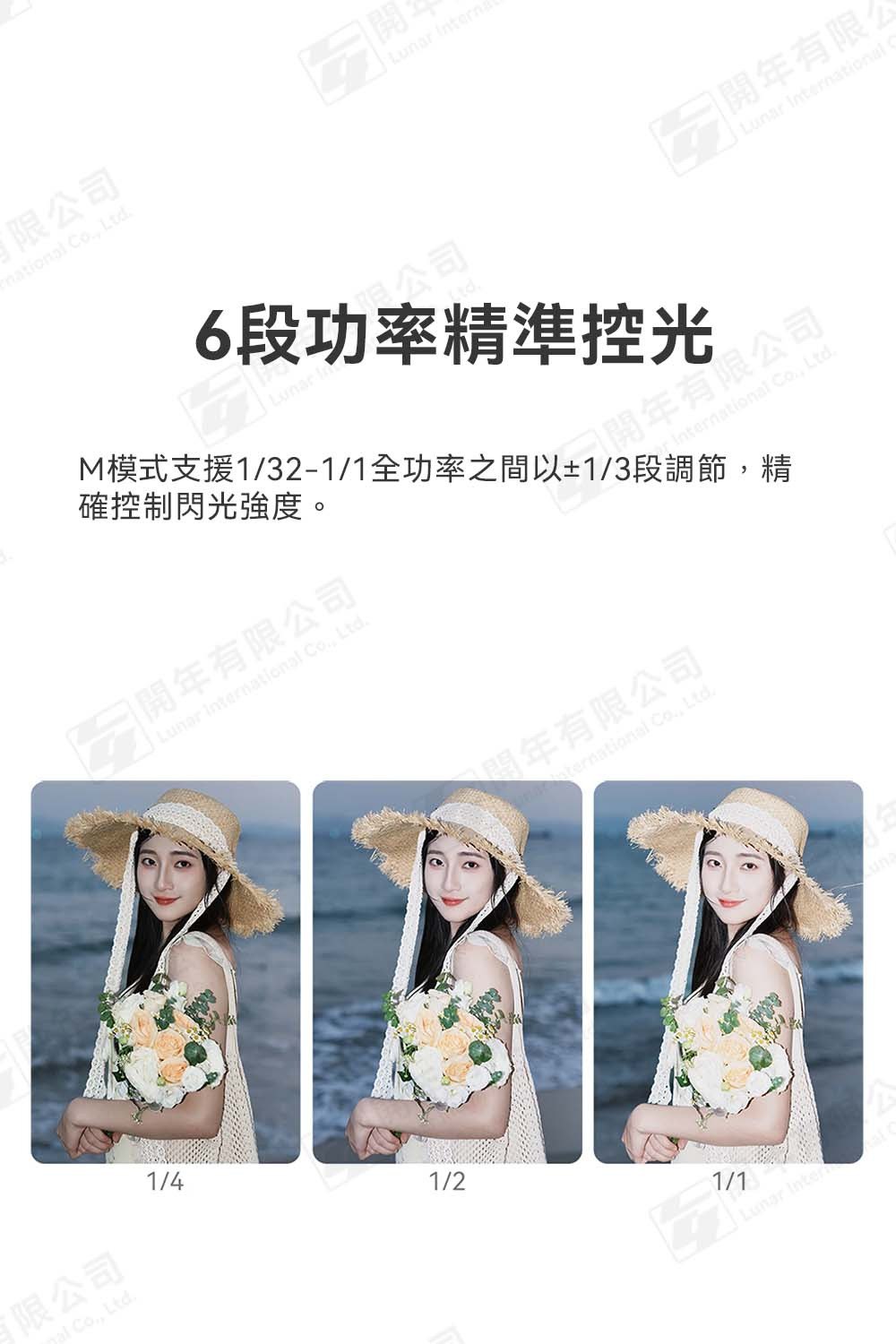 M模式支援1/32-1/1全功率之間以±1/3檔調節,精確控制閃光強度。