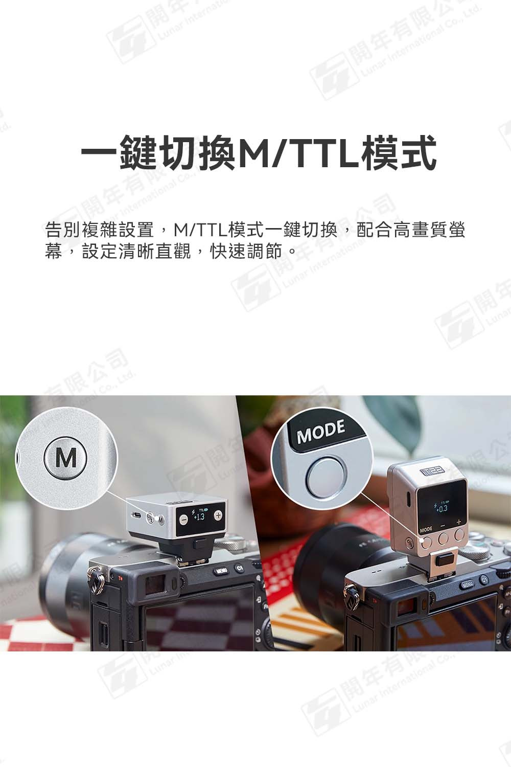 告別複雜設置,M/TTL模式一鍵切換,配合高清顯示屏,參數清晰直觀,快速調節。
