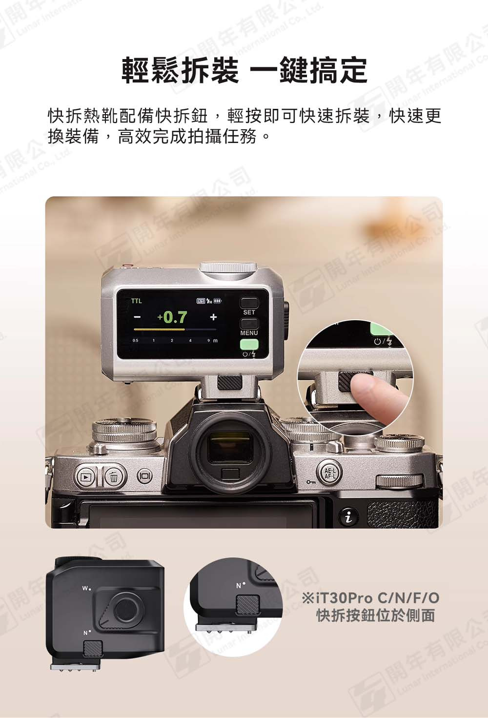 快拆熱靴配備快拆鈕,輕按即可快速拆裝,快速更換裝備