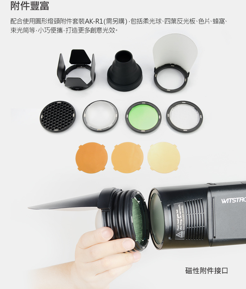 直接裝在AD200專用的H200R圓形燈頭, 也可以選購S-R1轉接座套上一般機頂閃光燈.