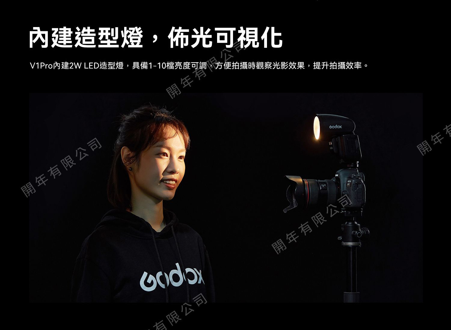 內建2W LED造型燈,具備1-10檔亮度可調,方便拍攝時觀察光影效果