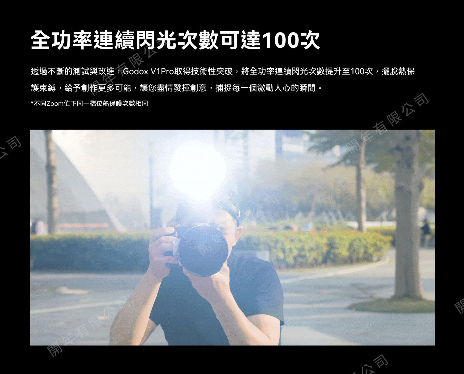 透過不斷的測試與改進,V1Pro將全功率連續閃光次數提升至100次,擺脫熱保護束縛,讓您盡情捕捉每一個激動人心的瞬間