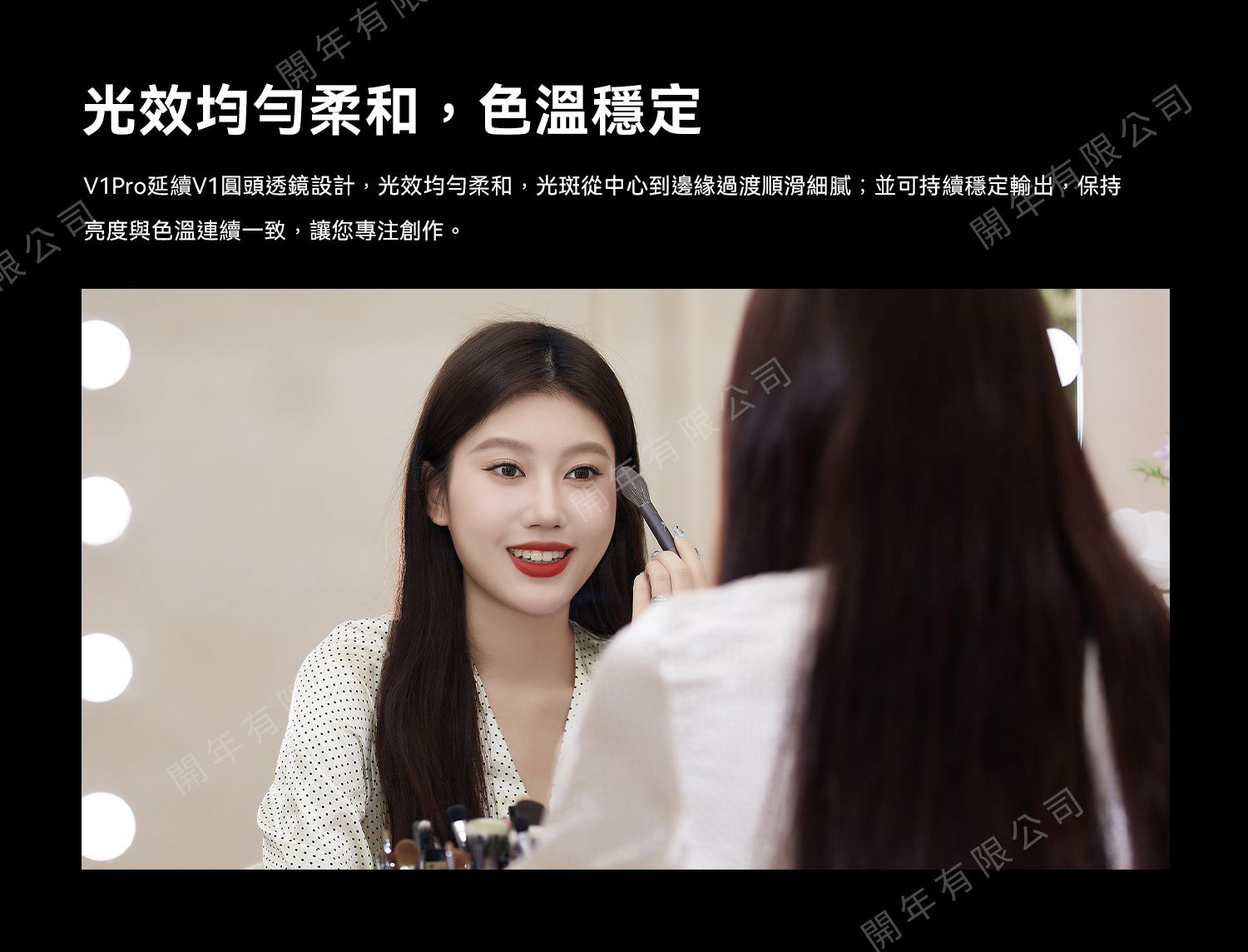 延續V1圓頭透鏡設計,光效均勻柔和,光斑從中心到邊緣過渡順滑細膩;並可持續穩定輸出,保持亮度與色溫連續一致