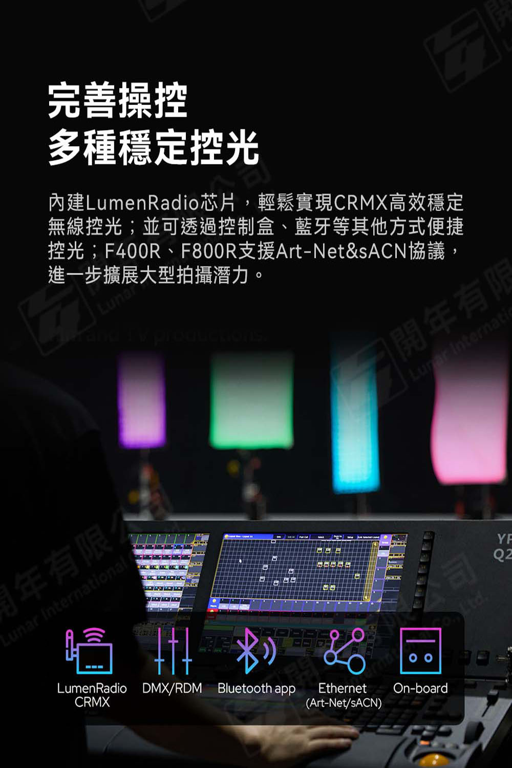 內建LumenRadio芯片,輕鬆實現CRMX高效穩定無線控光,並可透過控制器、藍牙等其他方式控光;F400R、F800R支援Art-Net&ACN協議