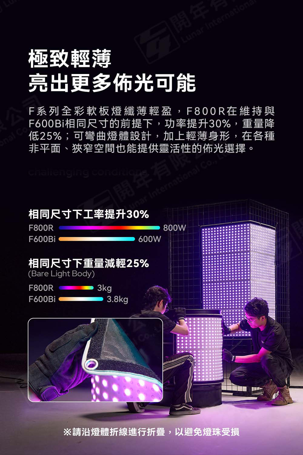 F800R維持與F600Bi相同尺寸,功率提升30%,重量降低25%;可彎曲燈體設計,提供靈活佈光選擇