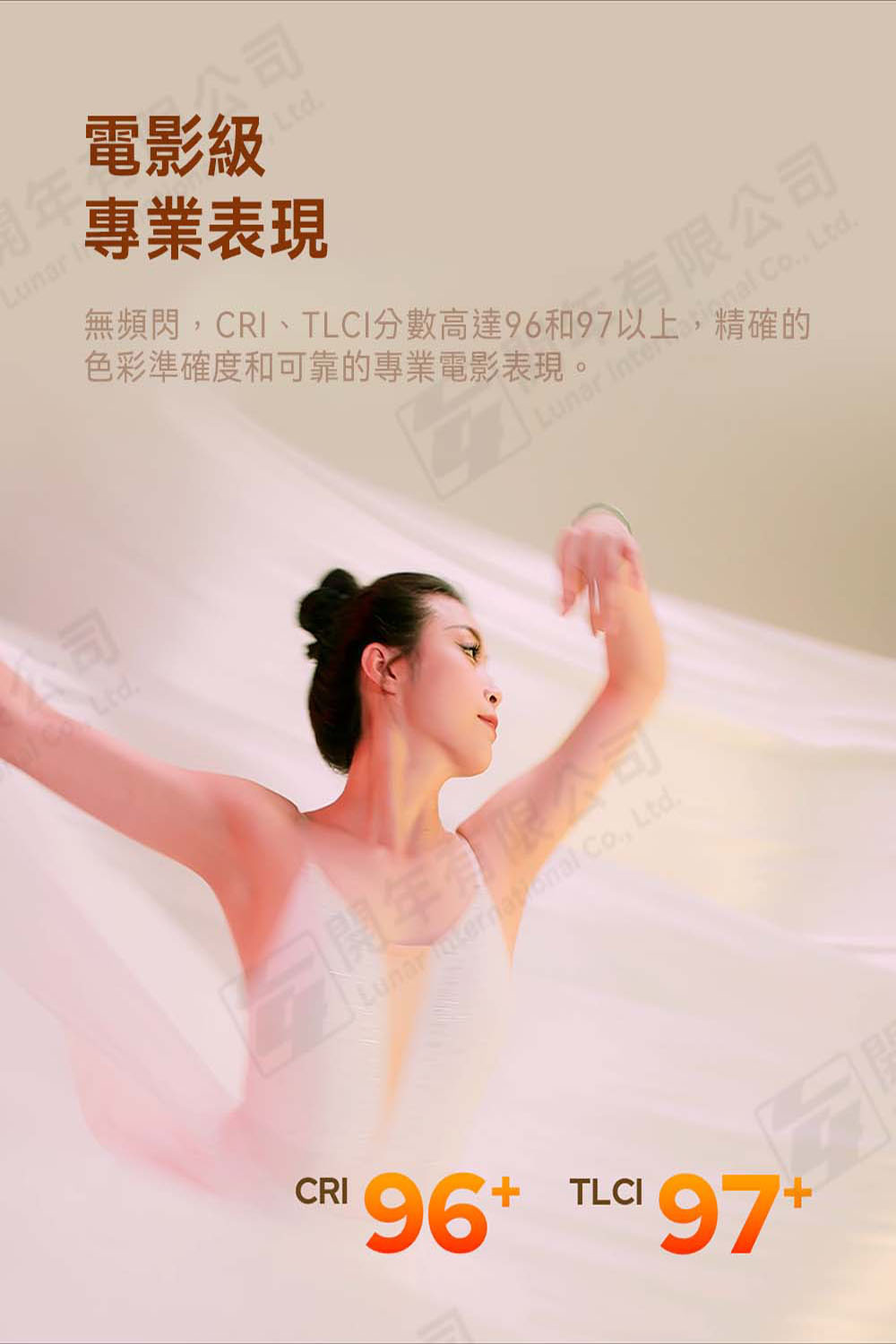 無頻閃,CRI、TLCI分數高達96和97以上,精準的色彩準確度和可靠的專業電影表現