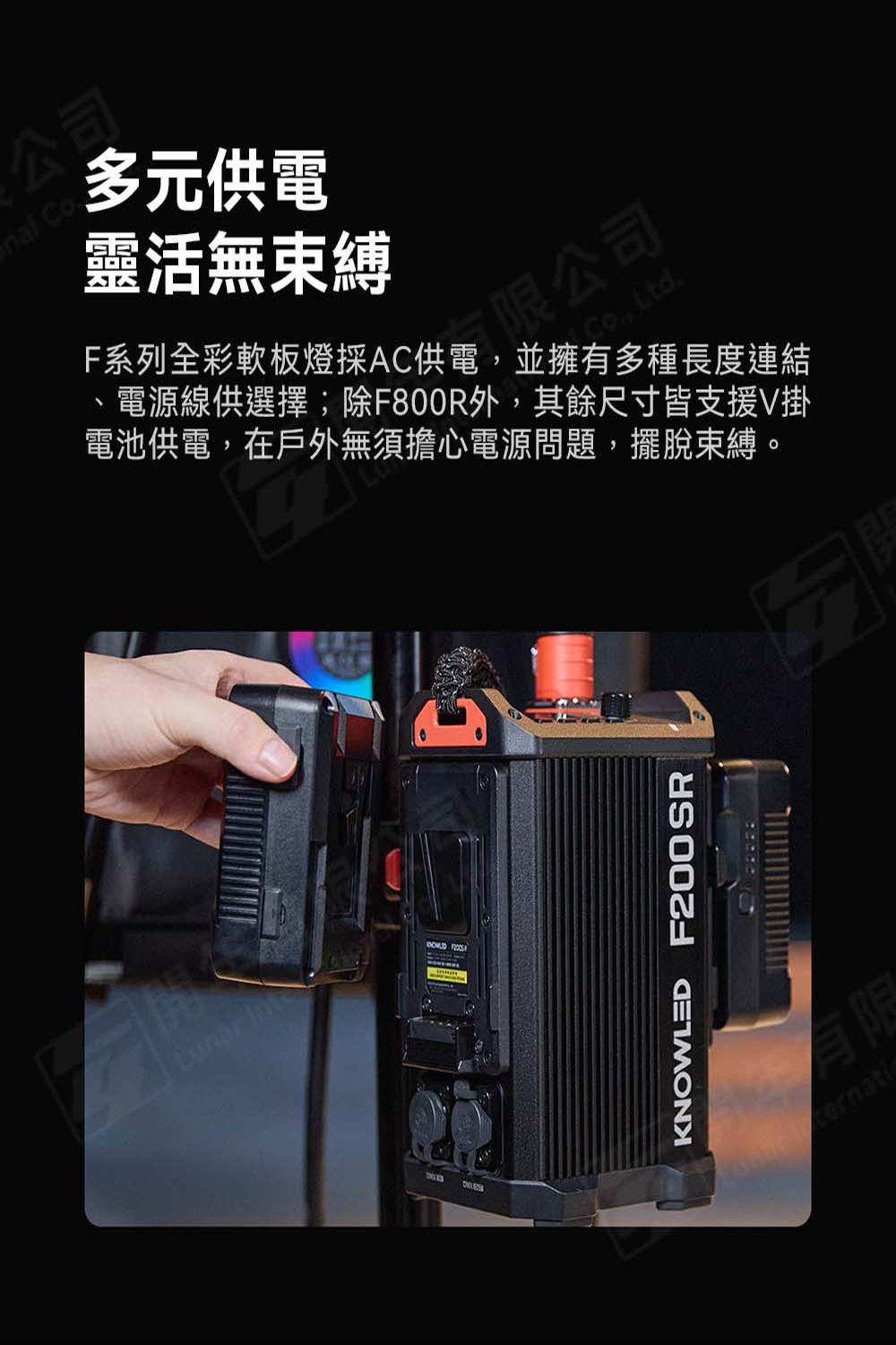 F系列全彩軟板燈採AC供電,並擁有多種長度連接、電源線可供選擇(需另購);除F800R外,其餘尺寸皆支援V掛電池供電