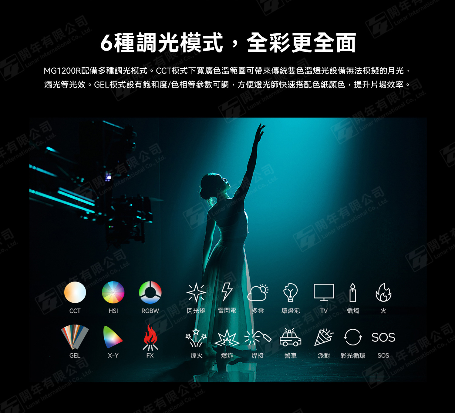 具備CCT/HSI/RGBW/GEL/X-Y/FX模式。GEL模式設有飽和度/色相等參數可調,快速搭配色紙顏色,提升片場效率