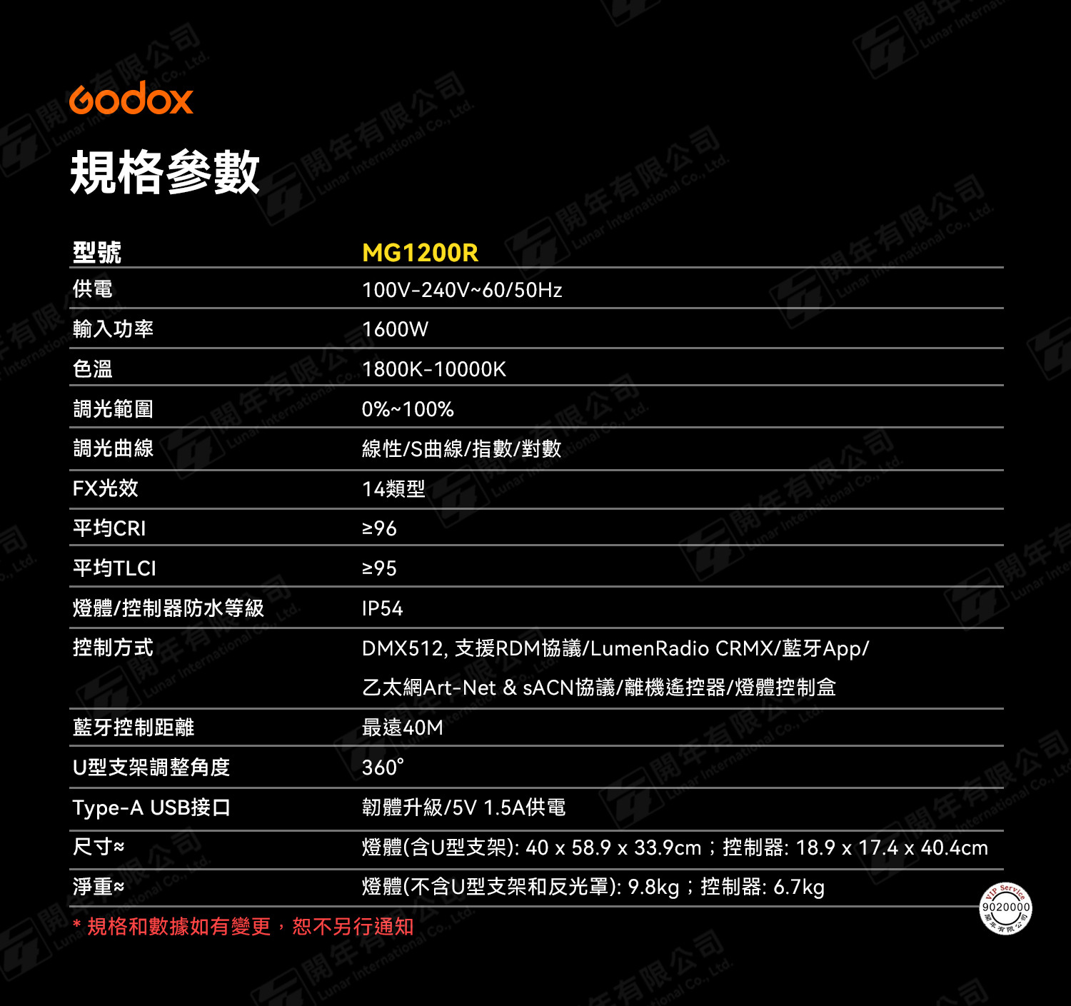 重量: 燈體(不含支架和反光罩)9.8kg / 控制器6.7kg