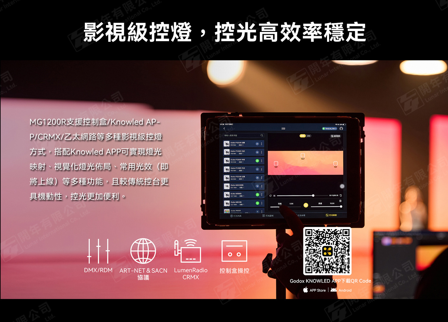 支援控制盒/Knowled APP/CRMX/乙太網等控燈方式,搭配Knowled APP可實現燈光映射、視覺化燈光佈局、常用光效等多種功能