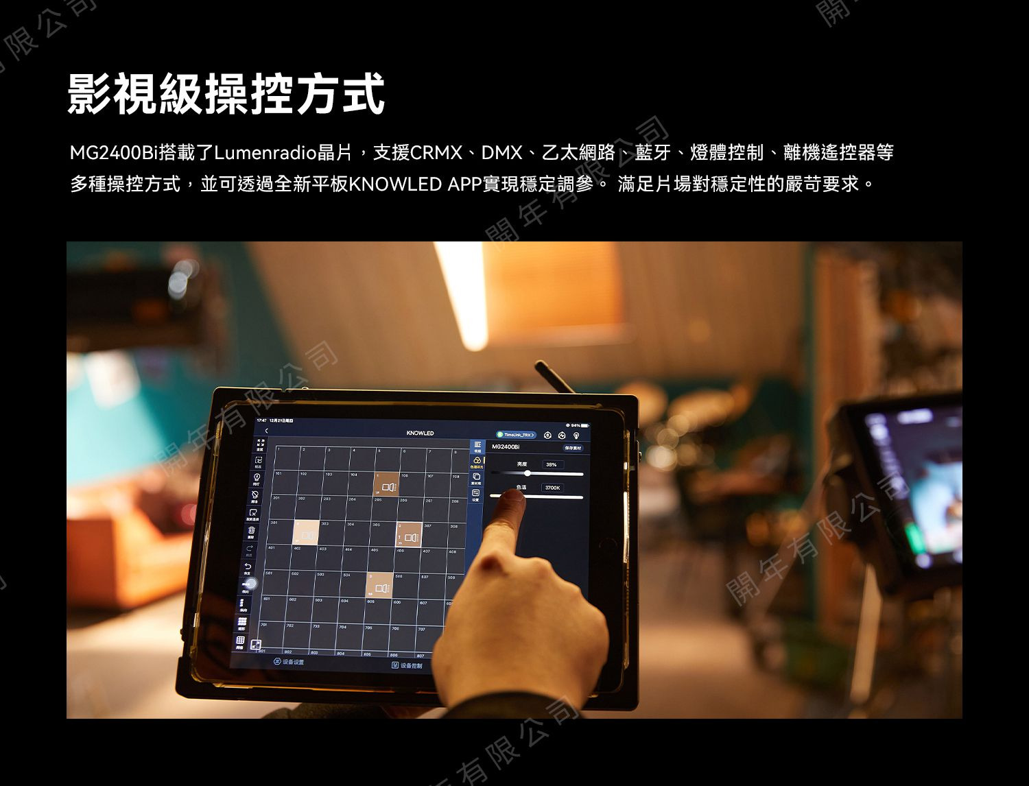 搭載Lumenradio晶片,支援CRMX、DMX、乙太網路、藍牙、燈體控制、遙控器等多種操控方式,並可透過平板KNOWLED APP調控參數