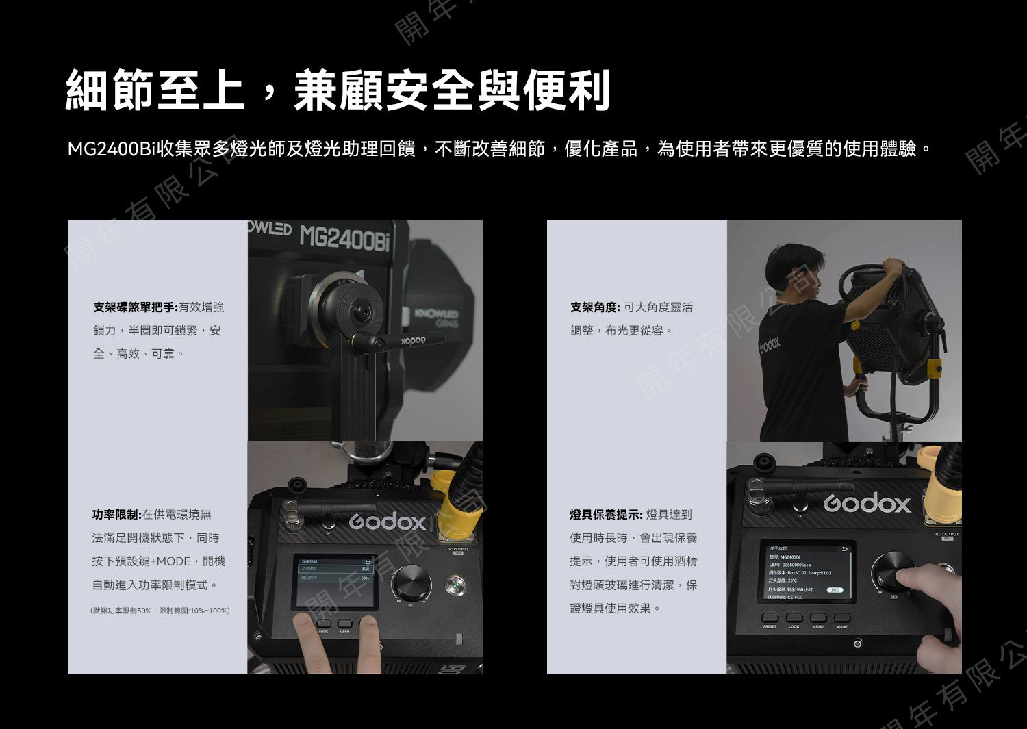 支架碟煞把手,半圈即可鎖緊,安全可靠;功率限制功能則可以在環境無法開機下手動啟用;燈具保養提示,能輕鬆維護設備