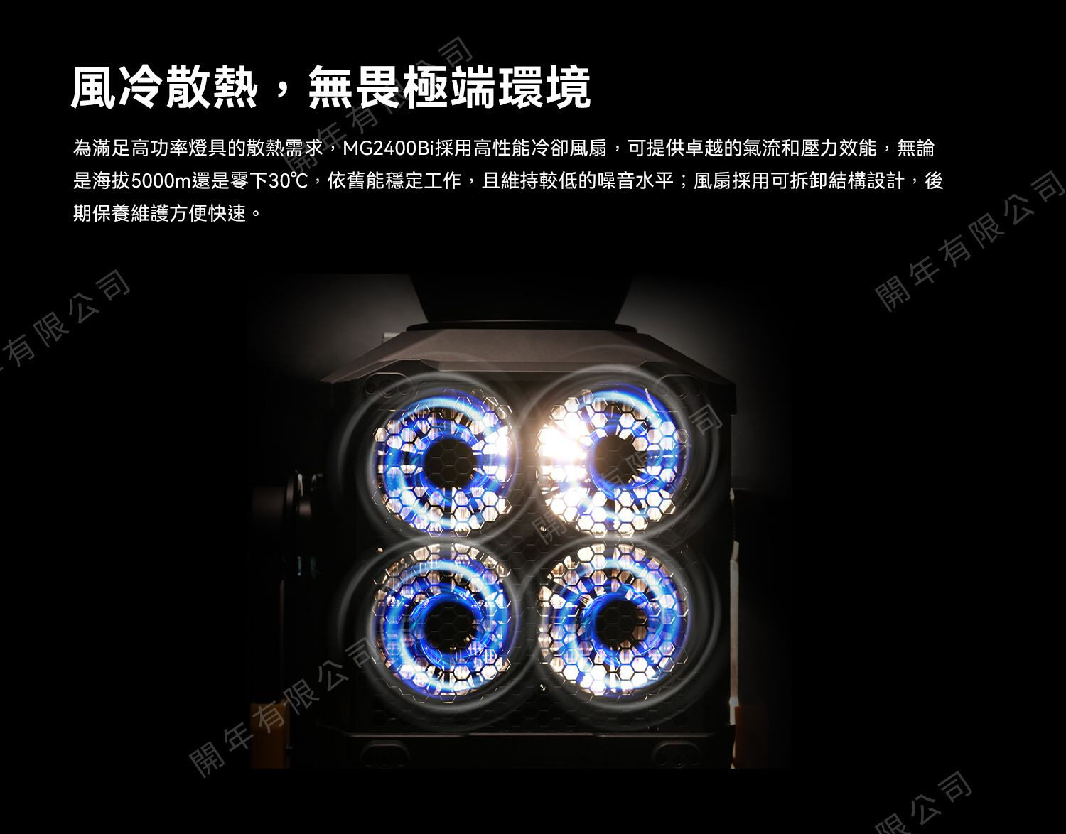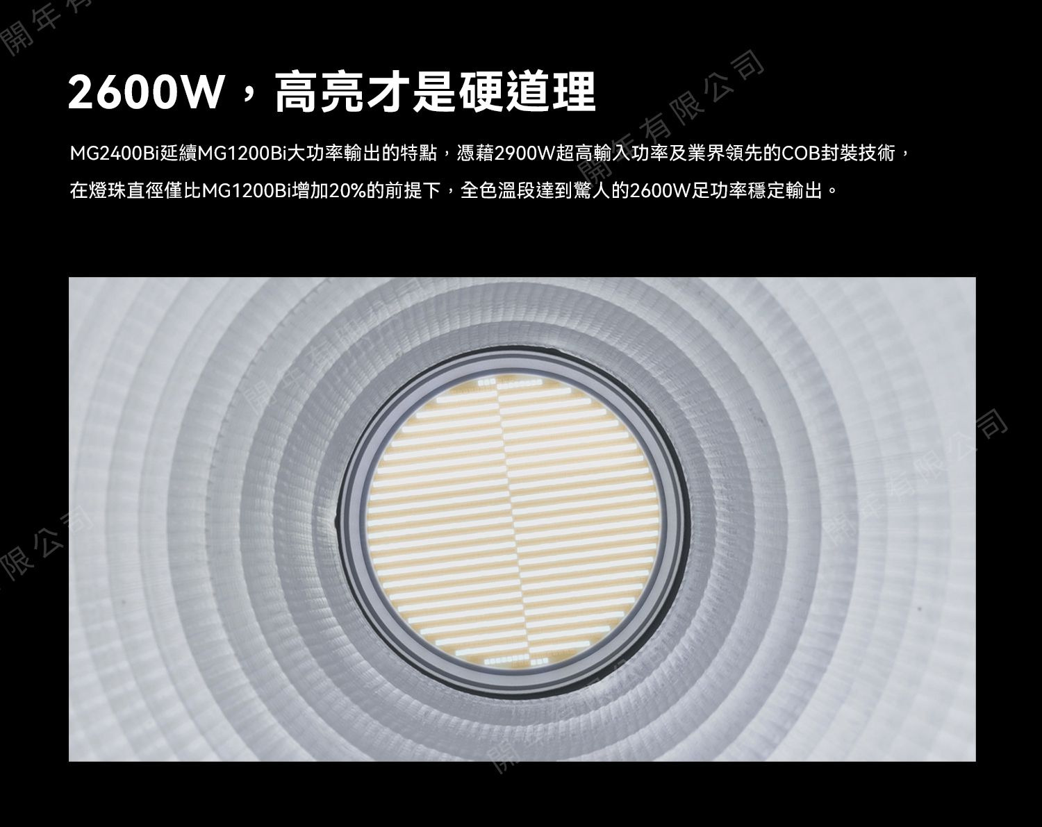 業界領先的COB封裝技術,在燈珠直徑僅比MG1200Bi增加20%之下,全色溫段達到驚人的2600W功率穩定輸出。