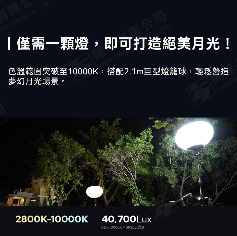 色溫範圍突破至10000K,搭配2.1m巨型燈籠球,輕鬆營造夢幻月光場景