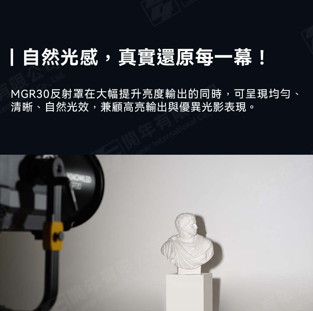 搭配MGR15反射罩,穿透力可媲美6K Par燈,MGR30反光罩則可營造均勻自然光效