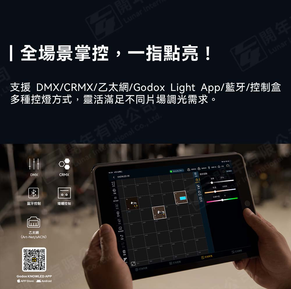 支援多種專業級控燈方式,包括DMX、CRMX、以太網與Godox Light APP
