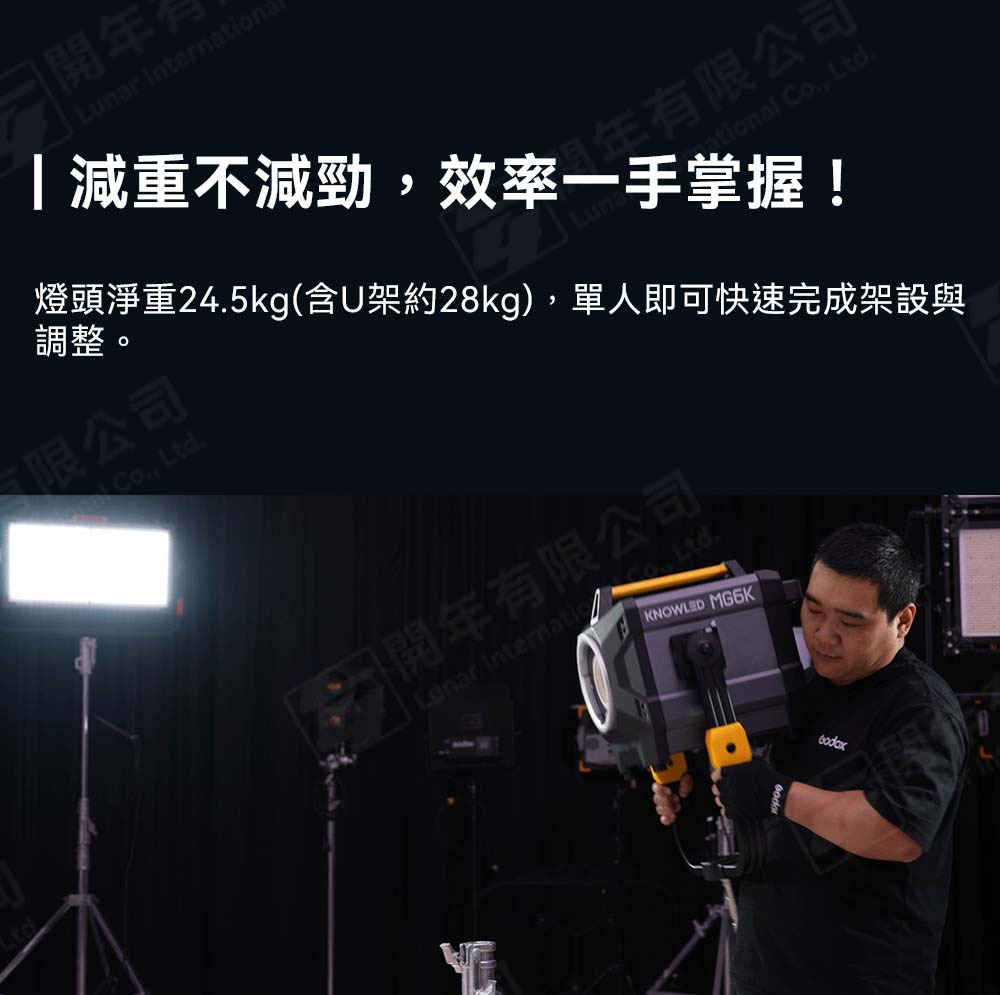 燈頭僅24.5kg(含U架約28kg),單人即可快速完成架設與調整