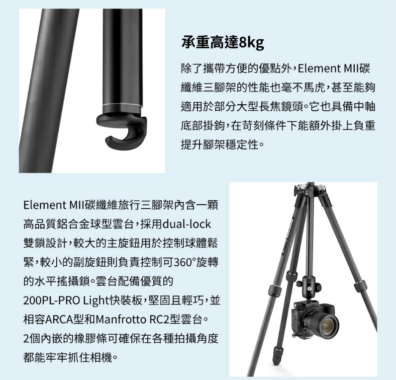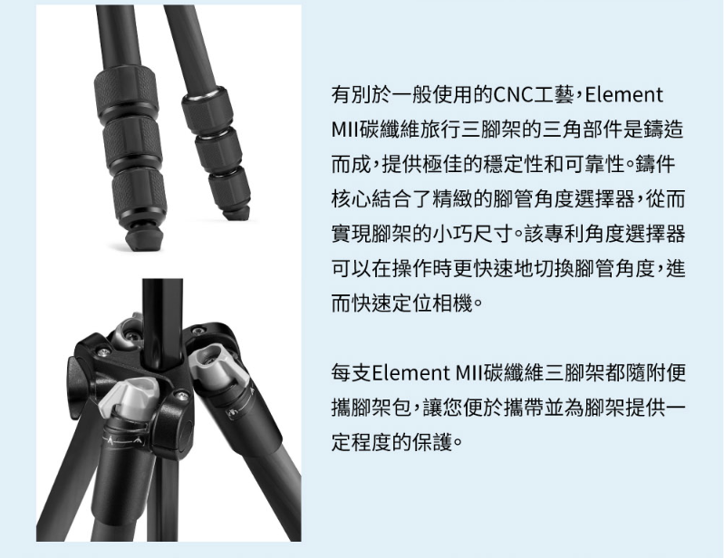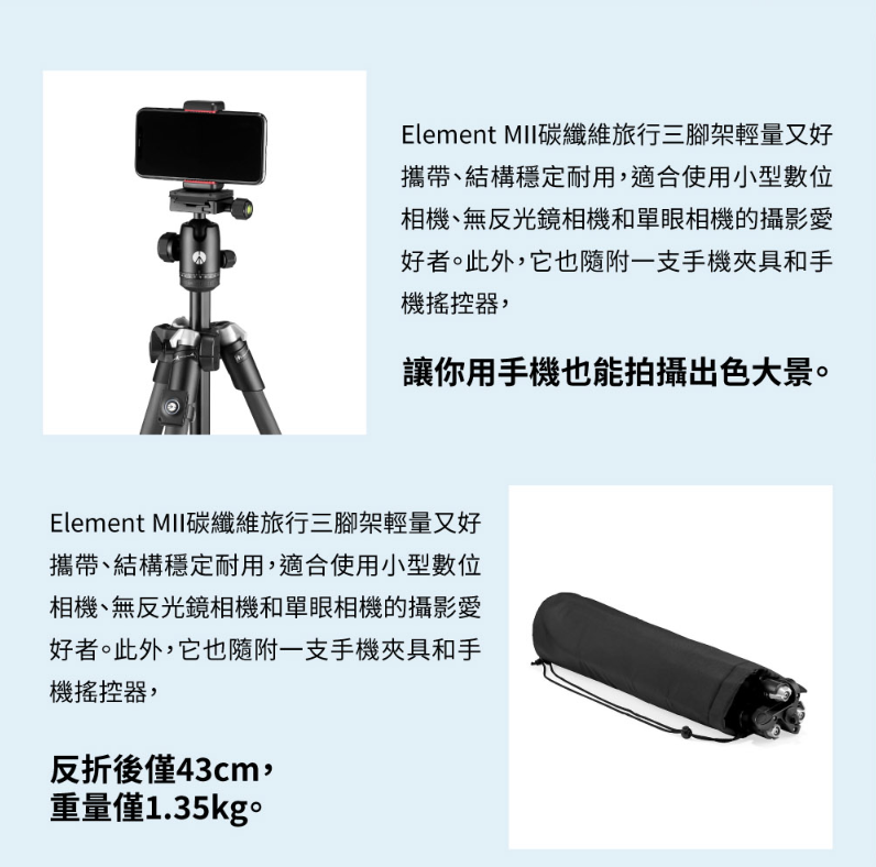 【大員視務所】Manfrotto 曼富圖 ELEMENT MII 碳纖維旅行輕便三腳架 送手機夾+遙控器 義大利原裝進口