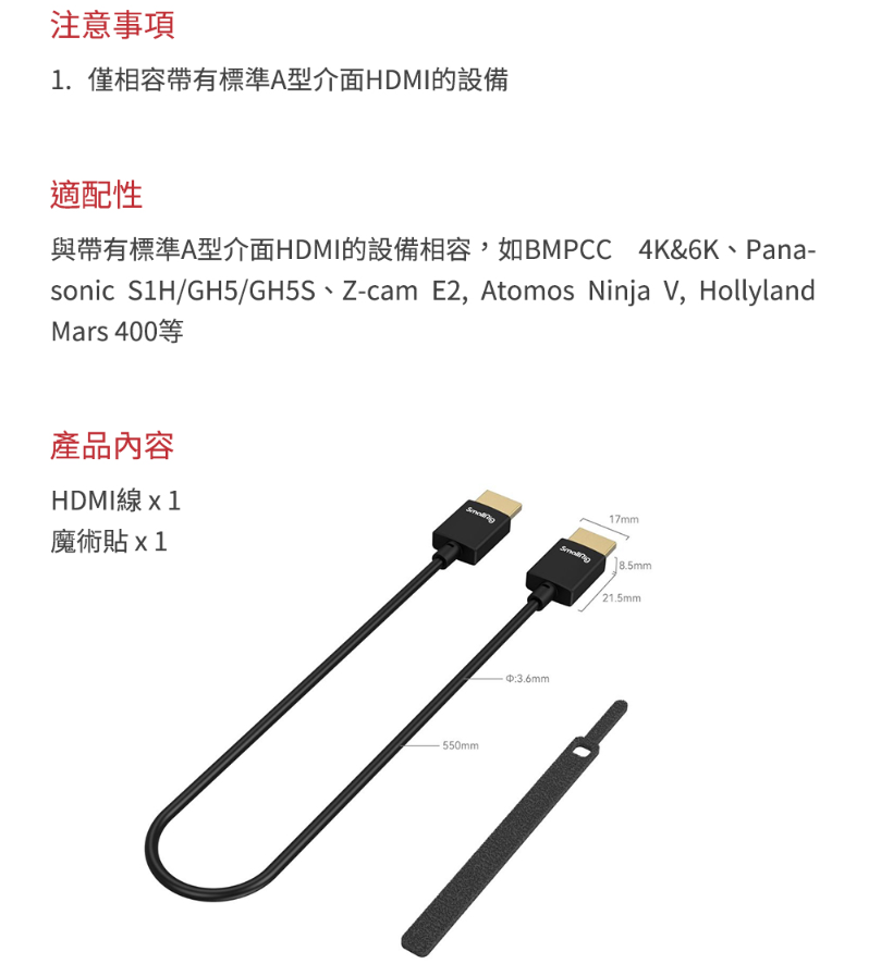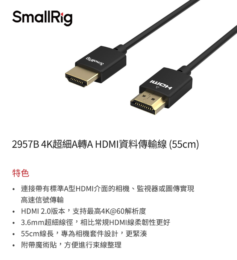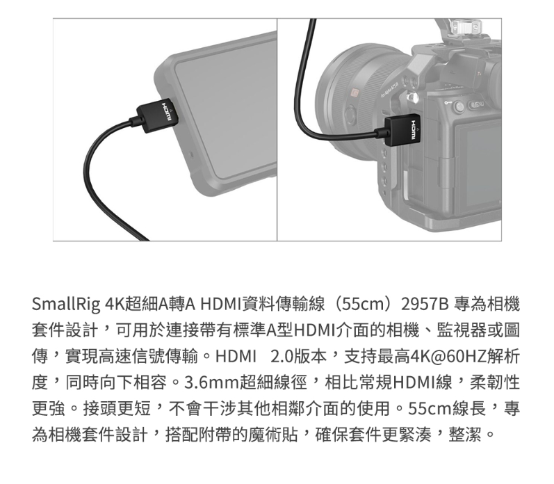 連接帶有標準A型HDMI介面的相機、監視器或圖傳實現高速信號傳輸