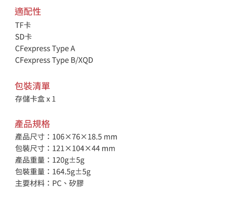 支持SD卡、Micro SD卡、CFexpress Type A卡、CFexpress Type B卡、XQD卡等存儲卡