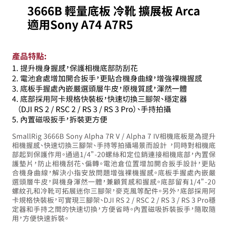 底部採用阿卡規格快裝板,快速切換三腳架、穩定器(DJI RS 2 / RSC 2 / RS 3 / RS 3 Pro)、手持拍攝