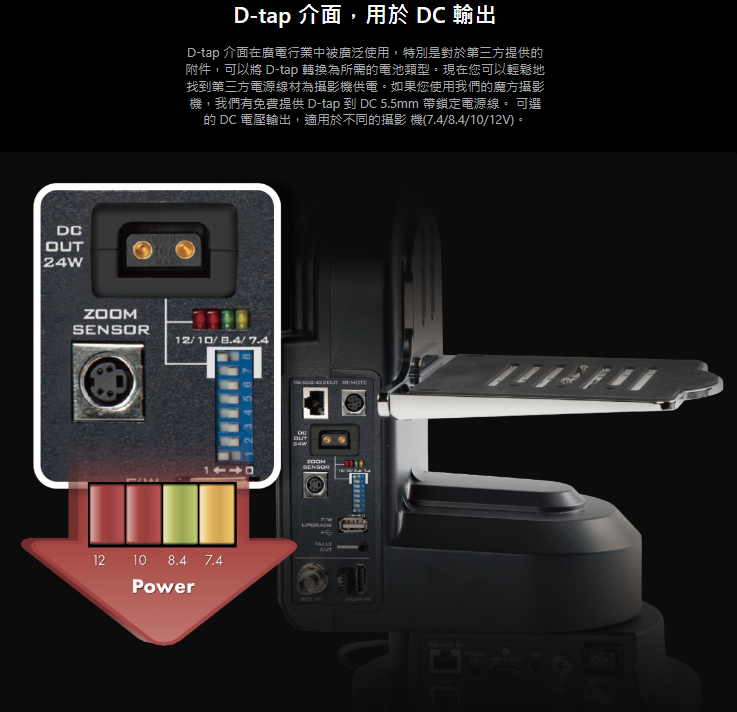 PTR-10 Mark II 導入廣電行業中被廣泛應用D-tap 介面,可為搭載的攝影機供電。隨產品所附的 D-tap 轉 DC5.5 連接線,可用於連接 Datavideo 的方塊攝影機,並可選擇直流電的輸出電壓(7.4/8.4/10/12V),適用於不同的攝影機。