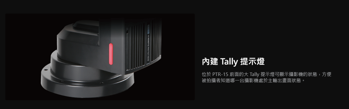 位於 PTR-15 前面的大 Tally 提示燈可顯示攝影機的狀態,方便被拍攝者知道哪一台攝影機處於主輸出畫面狀態。