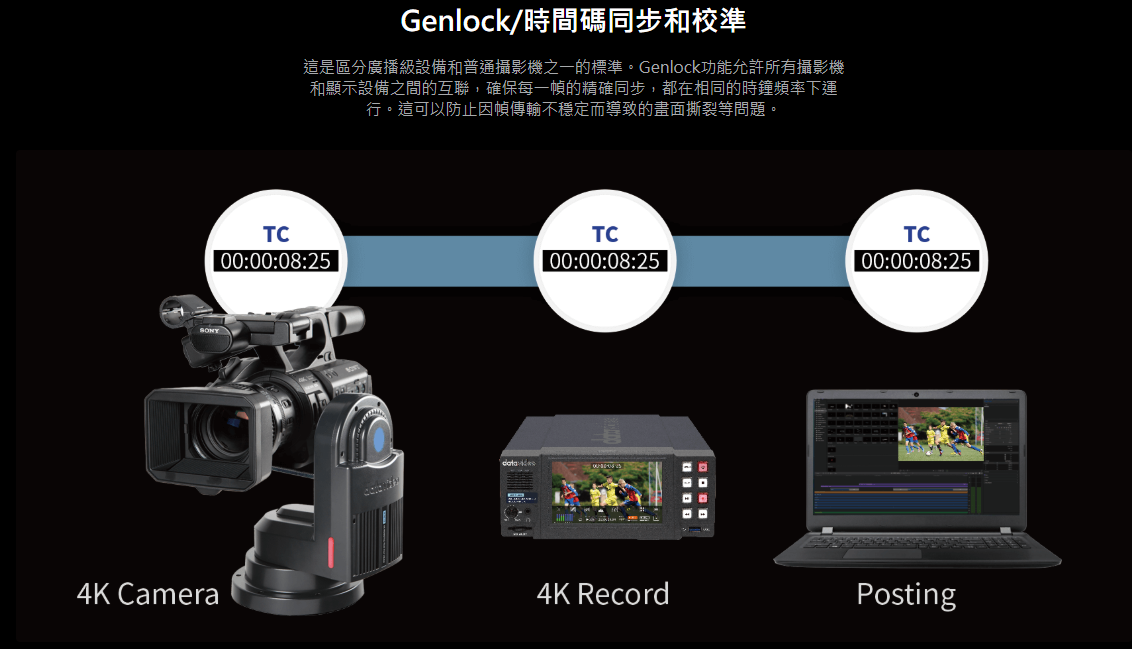 時間碼校準功能使所有攝影機和錄製設備能夠相互連接,提供相同的時間參數。這建立了統一的時間參考點,供後續存檔或後期製作使用,確保一致性。
