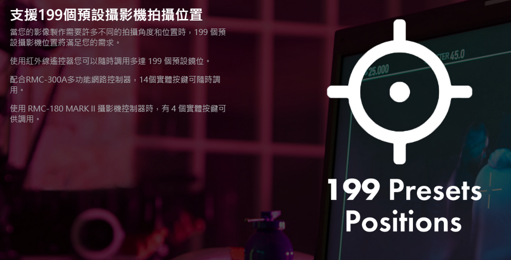 當您的影像製作需要許多不同的拍攝角度和位置時,199 個預設攝影機位置將滿足您的需求。