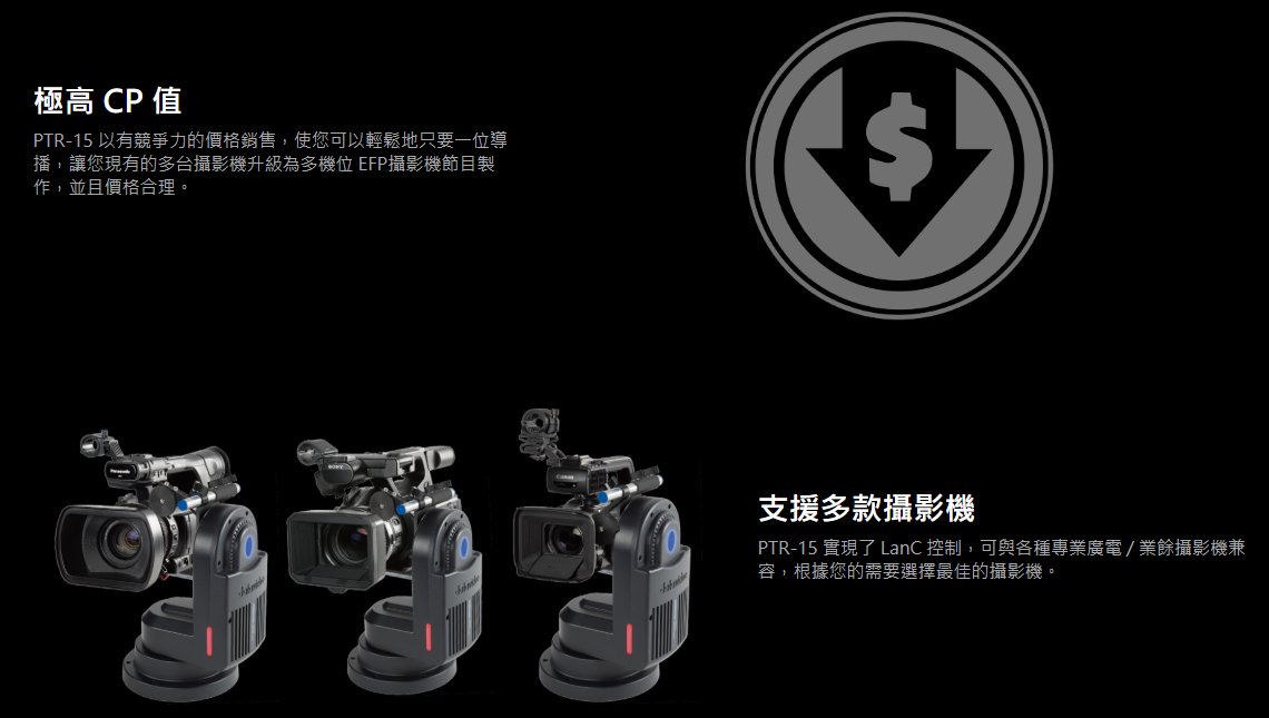 PTR-15 以有競爭力的價格銷售,使您可以輕鬆地只要一位導播,讓您現有的多台攝影機升級為多機位 EFP攝影機節目製作,並且價格合理。