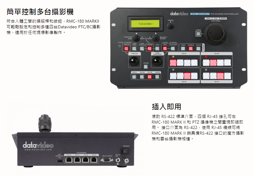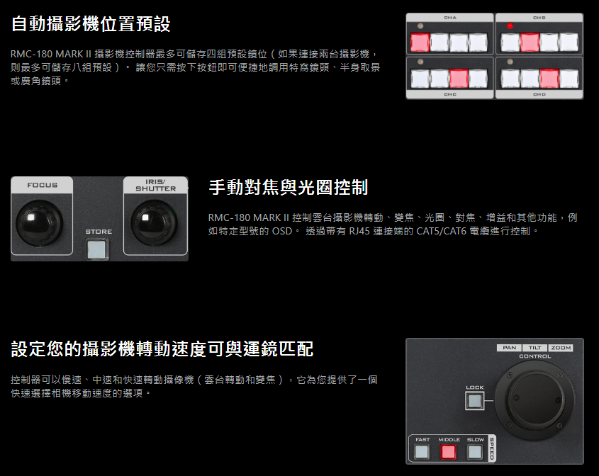 RMC-180 MARK II 控制雲台攝影機轉動、變焦、光圈、對焦、增益和其他功能,