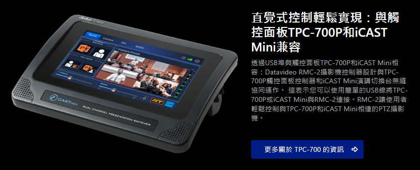 透過USB埠與觸控面板TPC-700P和iCAST Mini相容:Datavideo RMC-2攝影機控制器設計與TPC-700P觸控面板控制器和iCAST Mini演講切換台無縫協同運作。
