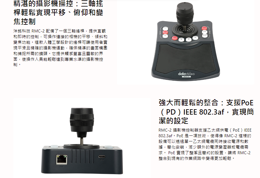 洋銘科技 RMC-2 配備了一個三軸搖桿,提供直觀和即時的控制,可操作連接的相機的平移、傾斜和變焦功能。