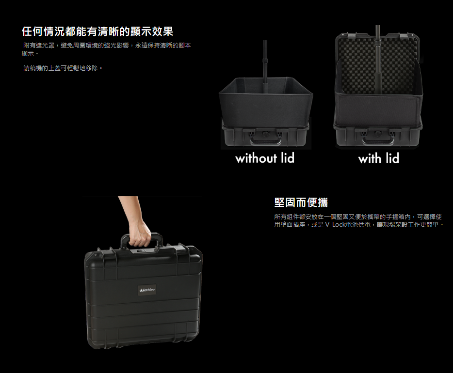 所有組件都安放在一個堅固又便於攜帶的手提箱內,可選擇使用壁面插座,或是 V-Lock電池供電,讓現場架設工作更簡單。