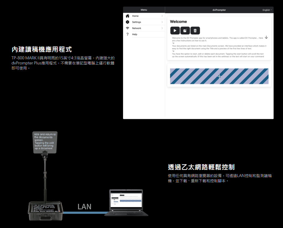 TP-800 MARK II具有明亮的15英寸4:3液晶螢幕,內建強大的dvPrompter Plus應用程式,不需要在筆記型電腦上運行軟體即可使用。